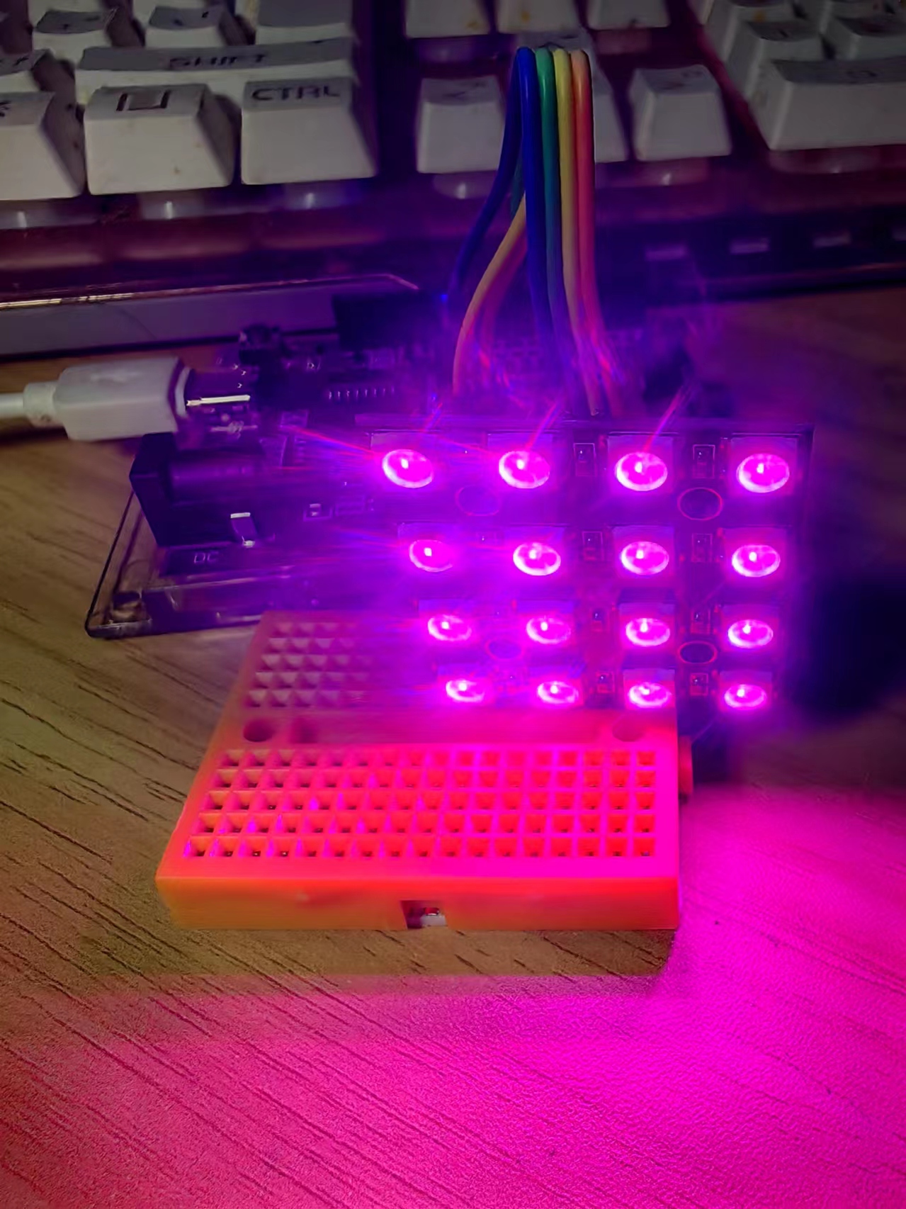 该屏幕由4行4列共16个WS2812B LED灯珠组成,每个灯珠都是一个独立的像素点。每个像素点内部集成了控制电路和RGB芯片,能够显示16777216种颜色。