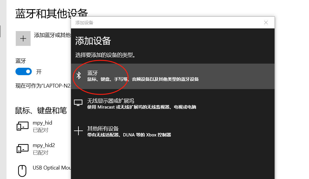 3、添加蓝牙设备,我用的是笔记本电脑来测试。