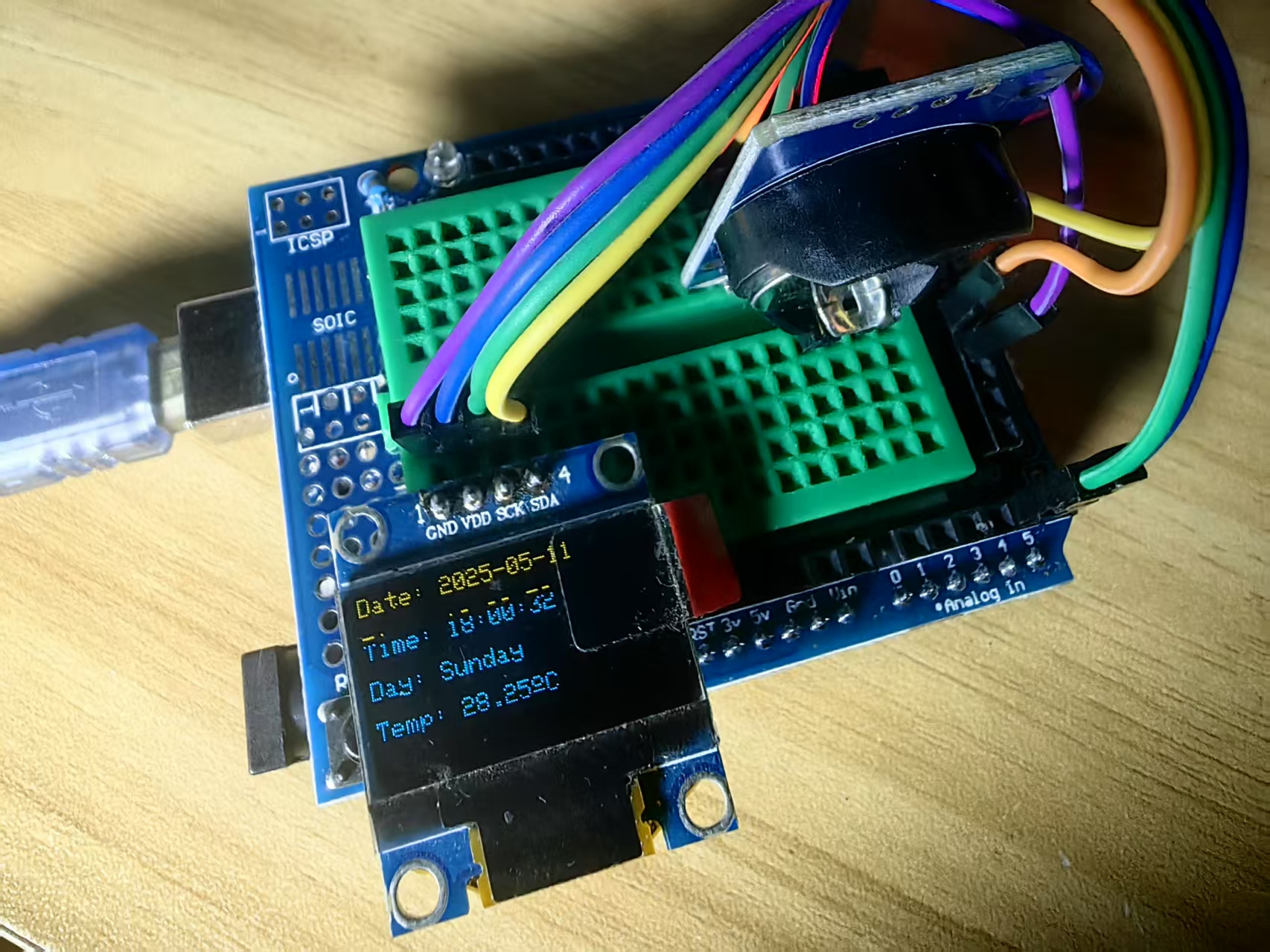 这段代码使用 DS3231 实时时钟(RTC)模块 和 OLED 显示屏 通过 I2C 通信 显示 当前日期、时间、星期和温度,核心逻辑如下: