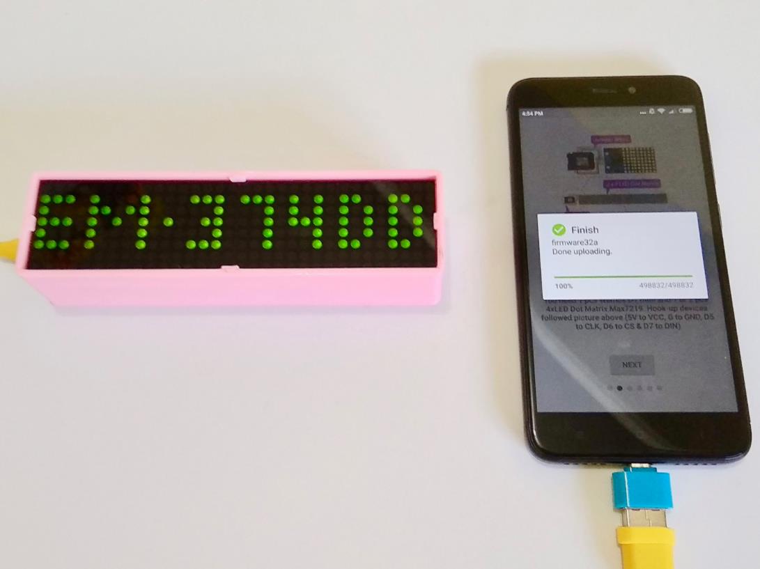 搭建简单,只需 Wemos D1 Mini 和 MAX7219 LED 点阵面板。无需编程技能,无需笔记本电脑/PC 即可对 Wemos ESP8266 微控制器进行编程,只需安卓手机通过 USB OTG 将草图/固件上传到 Wemos。它完全自主运行,并通过 Android 应用程序进行配置和控制,使用该应用程序,您可以通过简单的界面轻松配置和设置物联网智能时钟(ESPMatrix)设备。